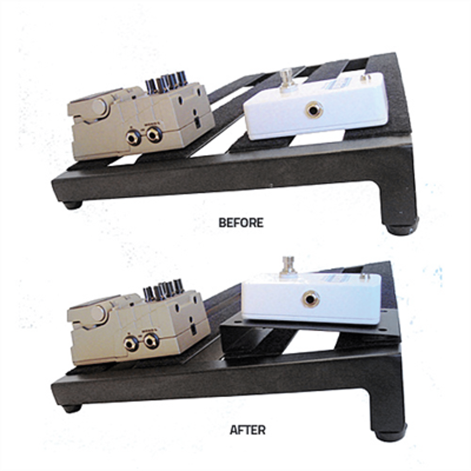 For example; on the front row you have an unusually tall pedal, and a short one right above it. Reaching that foot switch can be a precarious toe tap balancing act. Enter the Pedatrain Pedal-Booster. These handy little wedges will get the business end of your short pedal up a full one inch allowing easy access. Available is three widths to accommodate virtually any custom configuration. They can be fastened with the included Hook-and-loop with adhesive backing, or for a more permanent application use the provided screws. Folded steel construction, durable powder coat finish.
