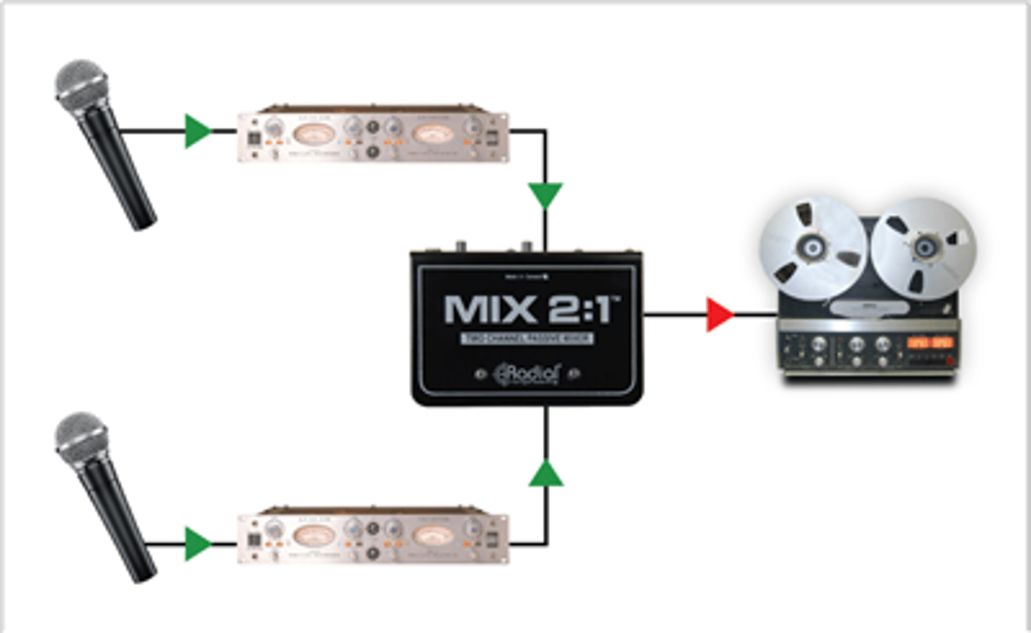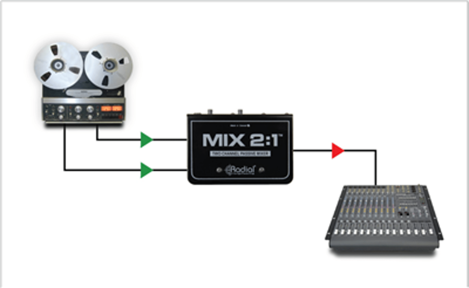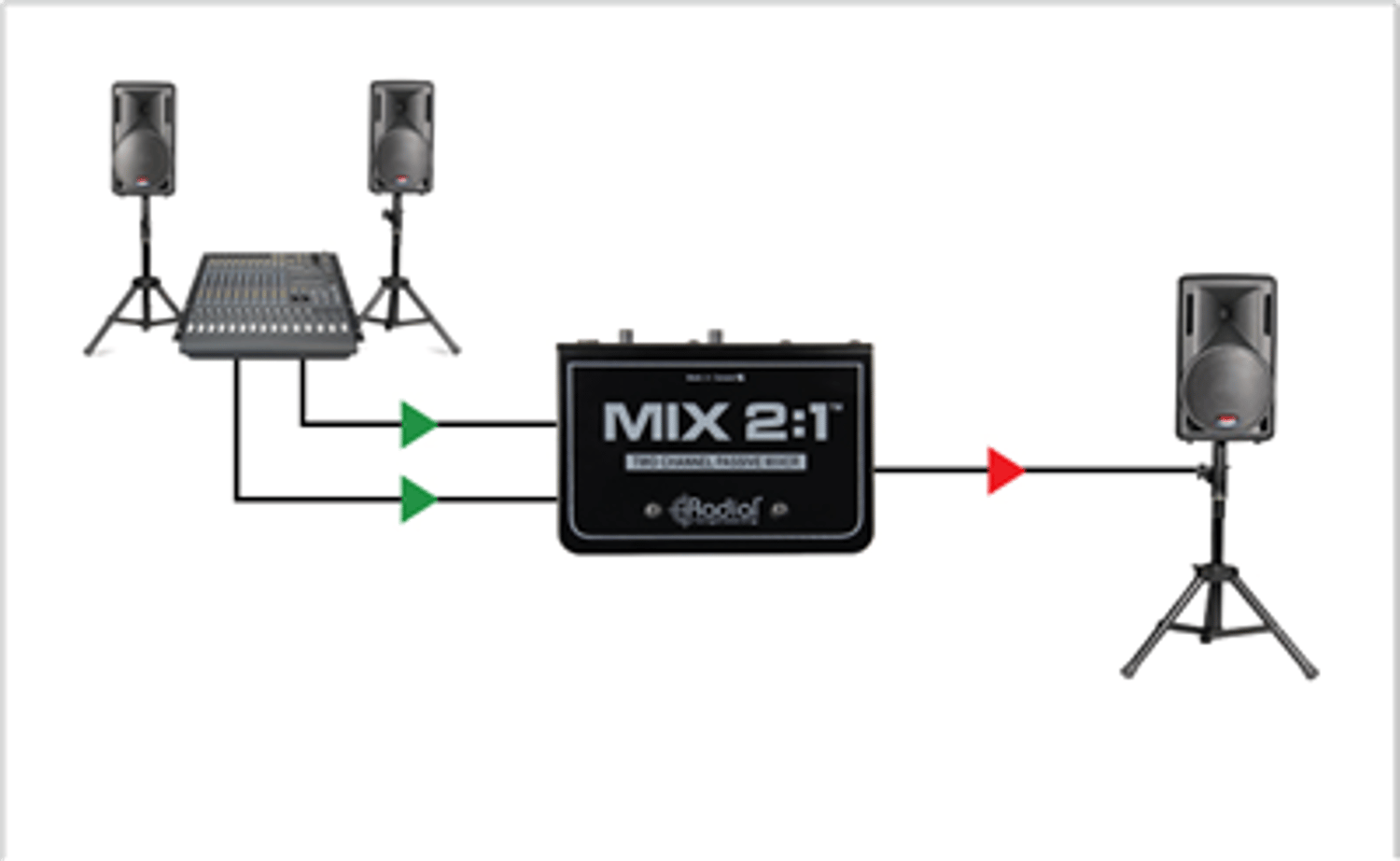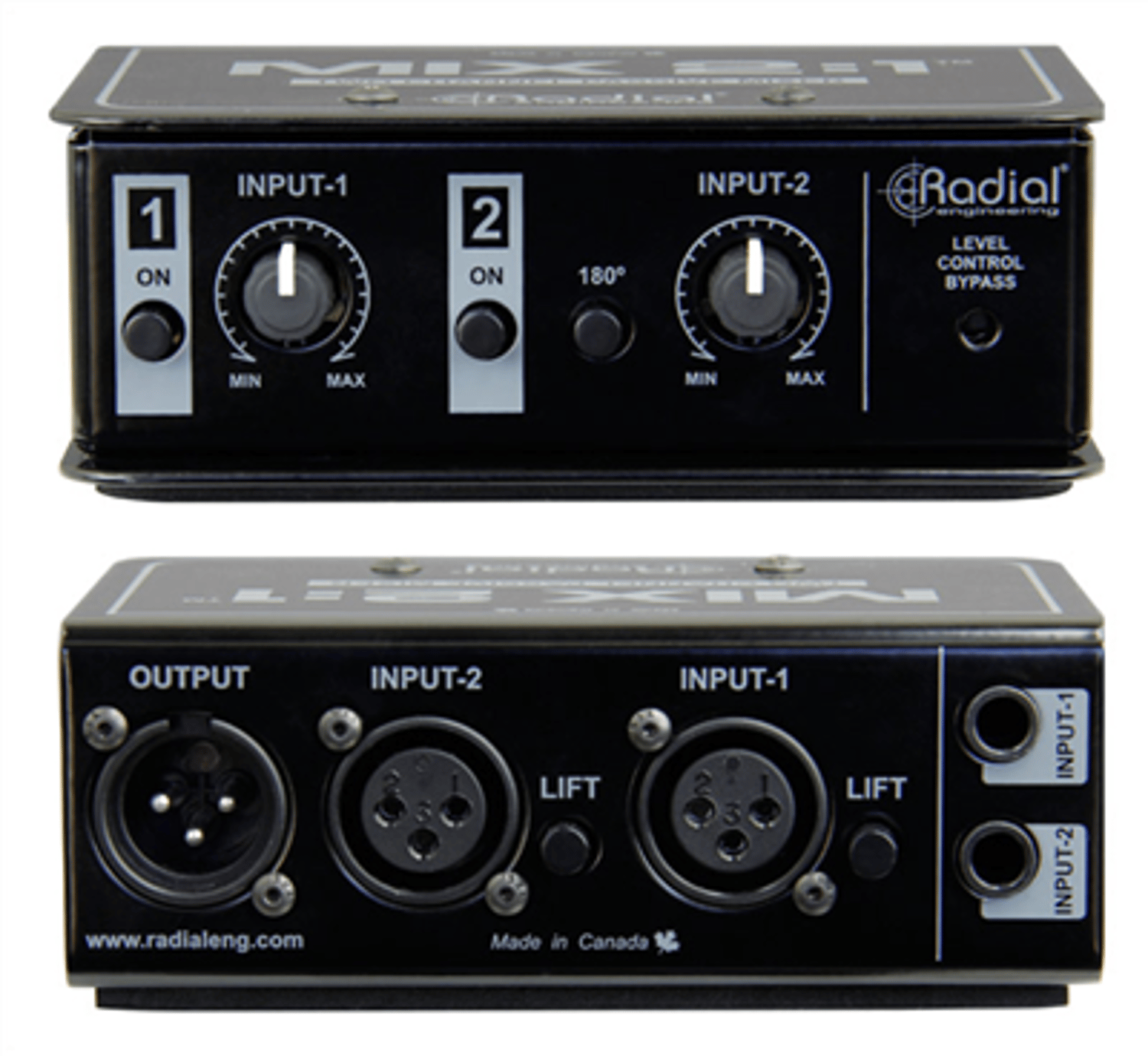 The MIX 2:1 has a 180° flip on Input-2, to help solve issues with frequency cancellation due to the inputs being out of phase. After both signals are passively summed together, they feed a single XLR output that can be connected to a powered speaker, or the input of a console or recording interface.