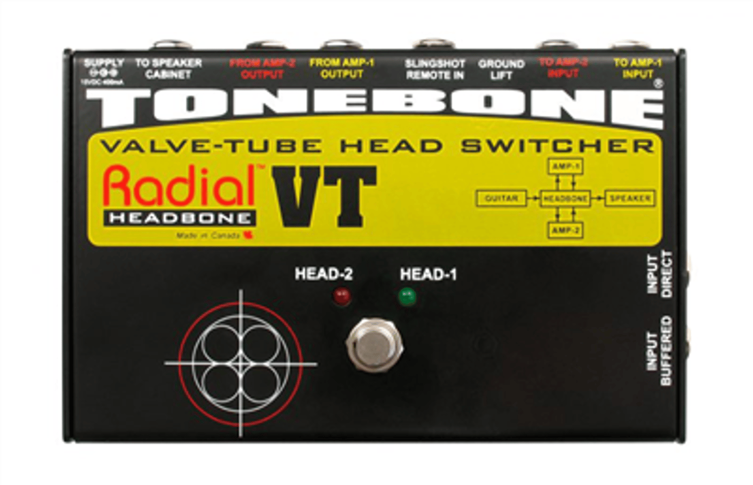 With the Headbone in your rig, you can access your choice of amplifier with a single footswitch, giving you the ability to easily select between one amplifier for rhythm, and another one for solos. To eliminate long cables running across the stage, you can switch the Headbone remotely with a Slingshot input that allows you to connect any standard footswitch or MIDI controlled contact closure, further streamlining your setup on stage. For the ultimate amp-switching rig you can combine the Headbone with the Tonebone Twinline, which will allow you to switch your effects loop at the same time, so your effects pedals follow the active amplifier.
